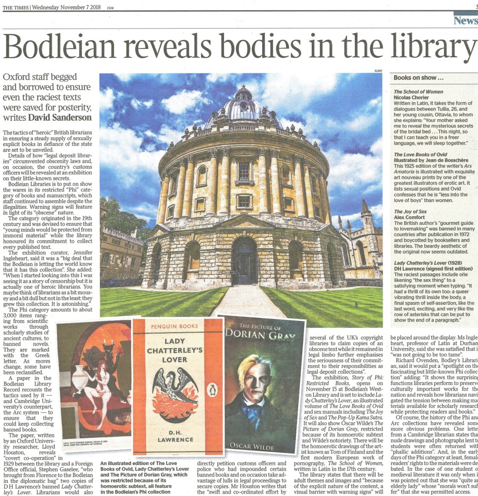 – ‘Bodleian Reveals Bodies in the Library’, The Times (07 November 2018), 3.