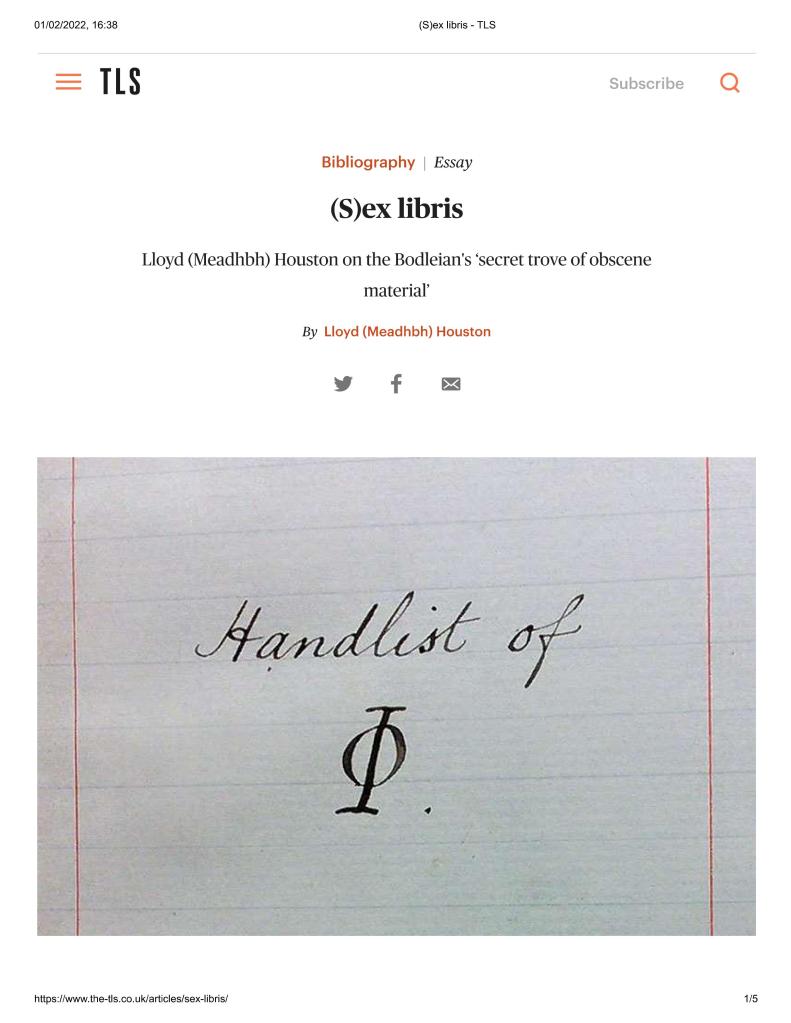 – ‘(S)ex Libris’, Times Literary Supplement (10 January 2019), Online.